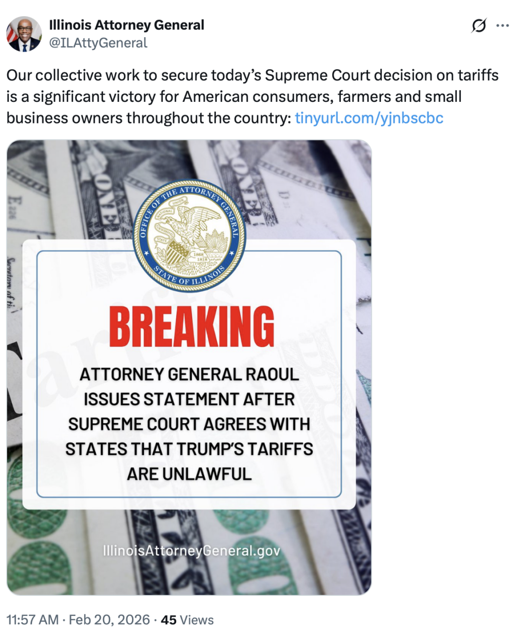 WASHINGTON, DC – Today, The U.S. Supreme Court struck down the Trump administration’s attempt to implement disastrous tariffs on the American people, handing a win to Democratic AGs who challenged the unlawful action in court by declaring Trump’s actions as illegal.