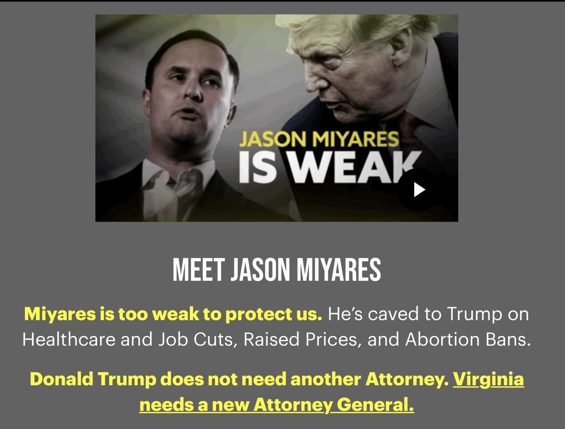 WASHINGTON, DC – Today, the campaign for Democratic nominee for Virginia Attorney General Jay Jones launched a new website, “Weak Jason Miyares”, that details all the ways Republican AG Jason Miyares has failed to stand up to Trump and defend Virginians, including Miyares’ failure to protect Virginians from rising prices, healthcare and job cuts, and his anti-abortion record.